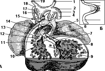 Рис.2. А - сердце эмбриона человека длиной 13 мм. Б - схема атриовентрикулярного соединения