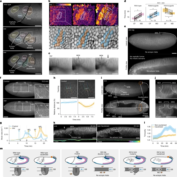 Сначала мы задались вопросом, требуются ли митотические расширения для формирования эктопических складок. С этой целью мы создали двойную мутантную линию, лишенную как головной борозды, так и митотических доменов, используя аллели с потерей функции btd и string (stg), ортолога фосфатазы cdc25, которая регулирует образование митотических доменов у Drosophila16. Отсутствие митотических доменов у мутантов stg не влияет на формирование головной борозды или другие гаструляционные движения16 (Расширенные данные на рис. 3а,б и дополнительные видеоролики 10 и 11). Однако отсутствие митотических доменов у двойных мутантов btd–stg подавляет образование эктопических складок (рис. 2e, расширенные данные рис. 3c, d и дополнительные видеоролики 12 и 13). Это указывает на то, что митотические расширения необходимы для появления эктопических складок у мутантов с головной бороздой.