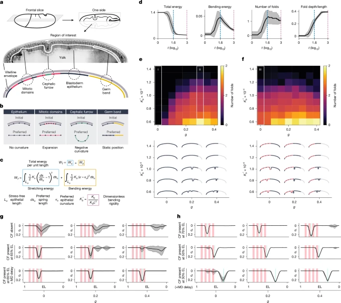 Чтобы охарактеризовать энергетическую динамику системы, мы провели моделирование, используя одно значение жесткости при изгибе и процент растяжения зародышевой полосы. Когда начинает формироваться складка, энергия изгиба увеличивается, высвобождая большое количество энергии растяжения, что уменьшает общую энергию системы (рис. 3d). Увеличение энергии изгиба совпадает с быстрым углублением складки. Как только энергия изгиба достигает пика, складка продолжает постепенно углубляться, но впоследствии количество складок редко меняется (рис. 3d и расширенные данные рис. 4b). Поскольку события сгибания являются стохастическими и происходят на разных итерациях в каждом моделировании, мы использовали пик энергии изгиба в качестве ориентира для стандартизации сравнения между моделированиями.