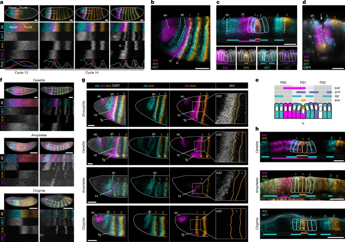 Эти три вида демонстрируют ранние соседние домены slp и eve, разграничивающие области головы и туловища по схеме, очень похожей на схему дрозофилы (рис. 4a, f и расширенные данные рис. 8a–c). Более того, поздний паттерн примыкающих полосок slp и eve почти идентичен у четырех видов (рис. 4a, f, g), а экспрессия prd отличается только в Clogmia, где клетки, экспрессирующие prd, не отличаются от полосок slp и eve (расширенные данные, рис. 8d, e). Основное различие, которое мы наблюдали между видами с головной бороздой и без нее, заключается в экспрессии btd. Хотя домен голова–туловище btd перекрывается с полосой eve 1 у Drosophila и Ceratitis, он не перекрывается с eve у Anopheles и полностью отсутствует у Clogmia (рис. 4g, h). Перекрытие btd–eve также отсутствует у Chironomus, другого двукрылого, у которого отсутствует головная борозда14. Эти результаты позволяют предположить, что эволюция головной борозды, возможно, была связана с пространственными изменениями в экспрессии btd и возникновением перекрытия btd–eve на границе головы и туловища.