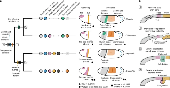Распределение признаков головной борозды по филогении двукрылых согласуется с гипотезой о механической нестабильности как избирательном воздействии (рис. 5 и расширенные данные рис. 9). Митотические домены и удлинение зародышевых полос — источники стресса — являются наследственными и развились до появления головной борозды, которая является производным признаком и эволюционной новизной циклоррафановых мух14 (рис. 5а). У видов без головной борозды клеточные деления на границе головы и туловища14 расположены вне плоскости, что является альтернативной стратегией для уменьшения сжимающих напряжений (рис. 5б). Поскольку установление перекрытия btd–eve связано с наличием головной борозды14 (фиг. 4 и 5а), различия в генетическом строении границы между головой и туловищем двукрылых, возможно, способствовали возникновению различных морфогенетических решений в ответ на аналогичное механическое избирательное давление (рис. 5б).