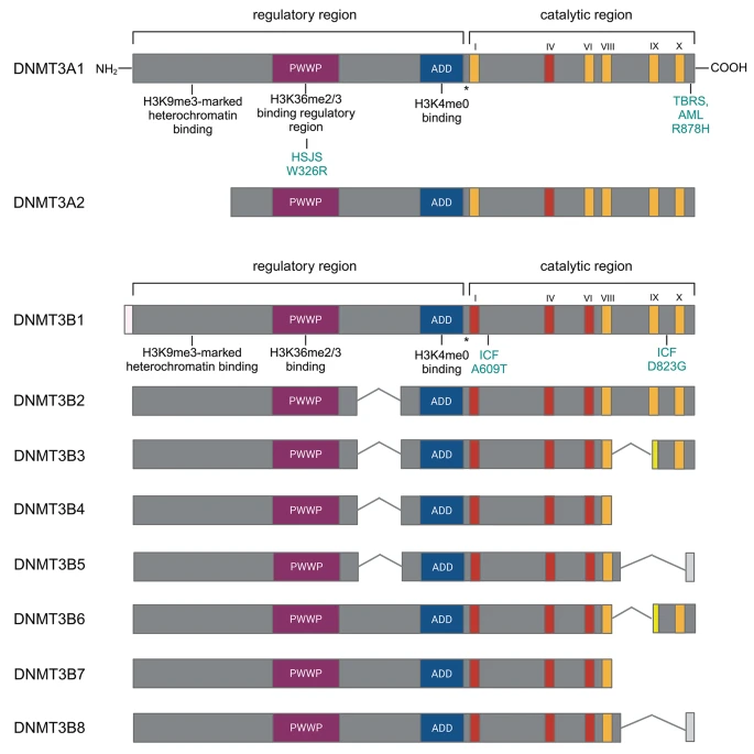 Семейство DNMT дополняют белки, участвующие в основном в метилировании de novo. DNMT3A и DNMT3B устанавливают профили метилирования ДНК в дифференцирующихся стволовых клетках, примордиальных зародышевых клетках во время раннего эмбриогенеза и в меньшей степени в дифференцированных клетках на более поздних этапах жизни [25, 26]. Эти ферменты имеют сходную доменную организацию (ADD, PWWP и метилтрансфераза) с очень высокой идентичностью последовательностей (~85 %) в каталитическом домене метилтрансферазы.