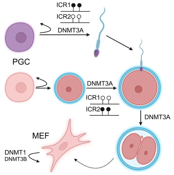 DNMT3A plays pivotal role in germ cell maturation and during preimplantation. Dnmt3a knockout primordial germ cells (PGC) are unable to differentiate to mature germ cells and can not establish parental-specific methylation patterns required for genomic imprinting. The PGCs maintain their ability to replicate and remain PGCs. DNMT3B plays minor role in complementing of the maintainance methylation activity of DNMT1 in mouse embryonic fibroblasts (MEF). ICRs are imprinting control regions. Lollipops represent CpG sites. Black CpGs are methylated, white CpGs are unmethylated