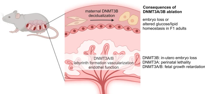 DNMT3A and DNMT3B are involved in fetal development. DNMT3B is required for the decidualization of the endometrium and the absence of the gene from progesterone-sensitive cells disturbs this process and leads to embryonic loss. Both DNMT3A and DNMT3B are required for labyrinth formation. The maintenance of Dnmt3b expression in trophoblast cells is crucial for embryonic development and survival