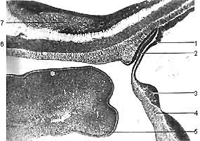 1 - утолщение стенки диэнцефалона - зачаток будущей задней доли гипофиза; 2 - карман Ратке; 3 - область перекреста зрительного нерва; 4 - recessus opticus; 5 - зачаток нижней губы; 6 - a. basilaris; 7 - задний мозг.