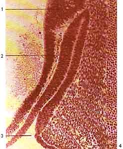 1- утолщение стенки диэнцефалона, зачаток задней доли гипофиза; 2 - карман Ратке ( его передняя стенка, в дальнейшем даст перреднюю долю гипофиза); 3 - отверстие кармана Ратке.