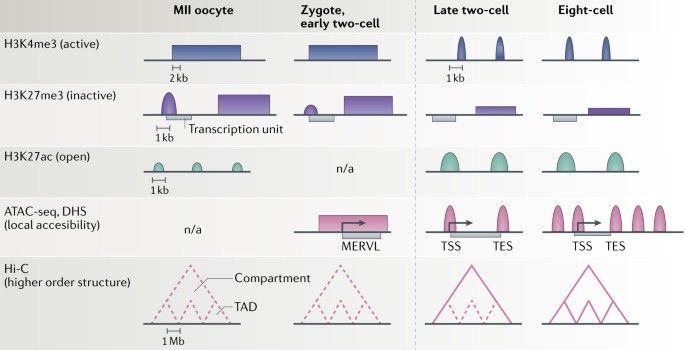 Ландшафт локального хроматина подвергается значительной реорганизации во время MZT. Недавно проведено профилирование всего генома путем картирования DNaseI hypersensitivity (DHS)73,82 и с помощью assay for transposase accessible chromatin-sequencing (ATAC-seq)72 пре-имплантационных эмбрионов, которые определяли доступность хроматина (Box 1; Supplementary Table S1). Как и в др. типах клеток, в зиготах, сайты DHS были в основном расположены в промоторах73,82 (Fig. 2). Ранние двух-клеточные эмбрионы перед большой ZGA, слабый и с шумами ATAC-seq профиль, с крупными доменами доступного хроматина, покрывающими гены минорной ZGA, такие как mouse endogenous retrovirus with leucine tRNA primer (MERVL) гены72(Fig. 2). Это коррелирует с разнородностью транскрипционного профиля на этой стадии и вообще отражает менее структуированный ландшафт хроматина перед ZGA. На поздней стадии двух-клеточных эмбрионов пики доступного хроматина присутствуют только на сайтах инициации транскрипции (TSS) , но что интересно, также на сайтах окончания транскрипции transcription end sites (TES)72 (Fig. 2). Этот уникальный признак двух-клеточных эмбрионов исчезает на более поздних эмбриональных стадиях, его биологическое значение остается неясным72. Признаки ландшафта хроматина отражаются на редкой субпопуляции two-cell-like (2C-like) мышиных ESCs, которые обнаруживают общее увеличение глобальной доступности хроматина, включая элементы MERVL 83,84 (Box 2).