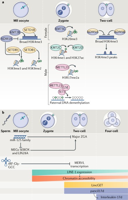 a | Histone-lysine N-methyltransferase 2B (KMT2B) establishes the broad histone H3 Lys4 trimethylation (H3K4me3) domains in metaphase II (MII) oocytes, which are subsequently removed by the lysine-specific demethylase 5A (KDM5A; also known as JARID1A) and KDM5B (also known as JARID1B) in two-cell embryos, leading to the formation of the canonical peaks of H3K4me3 distribution. SET domain containing 1B (SETD1B) also catalyses H3K4me3 in MII oocytes, but there is no experimental evidence that it establishes the broad H3K4me3 domains (dashed arrow). The methyltransferase SETDB1 catalyses the dimethylation and trimethylation of histone H3 Lys9 (H3K9me2 and H3K9me3, respectively) in MII oocytes. H3K9me3 is removed by the H3K4me3-specific and H3K9me3-specific demethylase KDM1A (also known as LSD1). In zygotes, KMT5C catalyses the trimethylation of histone H3 Lys20 (H3K20me3) at the maternal pronucleus; in the paternal pronucleus, KMT2C and KMT2D catalyse the monomethylation of H3K4 (H3K4me1) and support acetylation of histone H3 Lys27 (H3K27ac) enrichment. Methyltransferase-like 23 (METTL23) catalyses the asymmetric dimethylation of histone H3 Arg17 (H3R17me2a) and has a role in active DNA demethylation of the paternal pronucleus by recruiting the gonad-specific expression gene-ten-eleven translocation 3 (GSE-TET3) complex. Colours represent the role of the enzyme: yellow represents transcription during oocyte development; green represents minor zygotic genome activation (ZGA); blue represents major ZGA; and pink represents DNA (de)methylation proteins. b | Members of the microRNA miR-125 family are expressed in MII oocytes and suppress the expression of maternal-effect genes (MEGs), including SEBOX and protein lin-28 homologue A (LIN28A), and consequently suppress transcription during major ZGA. The 5? fragments of tRNA-Gly-GCC (tRF-Gly-GCC) are inherited by the zygote from the sperm under certain dietary conditions and negatively regulate the expression of murine endogenous retrovirus with leucine tRNA primer (MERVL) in two-cell embryos. Long interspersed nuclear element-1 (LINE-1) repeats are expressed from the zygote up to four-cell embryos and regulate chromatin accessibility. The long intergenic non-coding RNA LincGET is expressed in two-cell and four-cell embryos, similarly to promoter-associated non-coding RNA with interleukin-17d (pancIl17d), which promotes the expression of interleukin-17d from the four-cell stage.