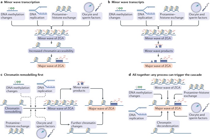 a | In model 1, the act of transcription itself in the minor wave of zygotic genome activation (ZGA) causes the chromatin to open up and become accessible, thereby enabling the major wave of ZGA to take place. b | In model 2, it is the products of the minor wave that are important in triggering the major wave. In both model 1 and model 2, the minor wave may be triggered by DNA methylation changes, DNA replication, protamine-histone exchange and/or factors present in the oocyte or sperm, among other possibilities. c | In model 3, the chromatin changes occur first, thereby enabling the minor ZGA wave, which then triggers, either through further chromatin changes or through its products, the major wave of ZGA?. d| In the final model, all processes are interconnected and occur concomitantly. Triggering any process can lead to a cascade of events that ultimately results in the major ZGA wave.