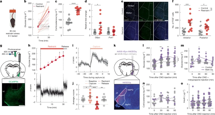 Стресс вызывает высокоорганизованные метаболические реакции, которые играют решающую роль в поддержании поведенческой адаптации к стрессу, необходимой для выживания. Нейронные механизмы, лежащие в основе метаболической пластичности, связанной со стрессом, в значительной степени неизвестны. Наши результаты указывают на важную роль популяции нейронов MeA, отвечающих за гипоталамус, в регуляции гипергликемических реакций на физические и социальные стрессоры. Неожиданно оказалось, что нейроны MeA регулируют уровень глюкозы в крови независимо от классических гормонов глюкорегуляции надпочечников и поджелудочной железы. Мы обнаружили, что нейроны MeA обеспечивают полисинаптическую связь с печенью через симпатическую нервную систему, стимулируя глюконеогенез в печени. Наши результаты убедительно доказывают, что миндалевидные системы управляют метаболическими реакциями на стресс посредством быстрого высвобождения глюкозы печенью. Многократное воздействие стресса вызывало адаптацию активности этих гепаторегуляторных нейронов MeA, что приводило к постоянному повышению уровня глюкозы в крови. Если эти результаты распространяются на людей, то они предполагают, что нарушение регуляции передачи сигналов MeA способствует увеличению частоты метаболических нарушений у людей, подвергающихся длительным периодам стресса.