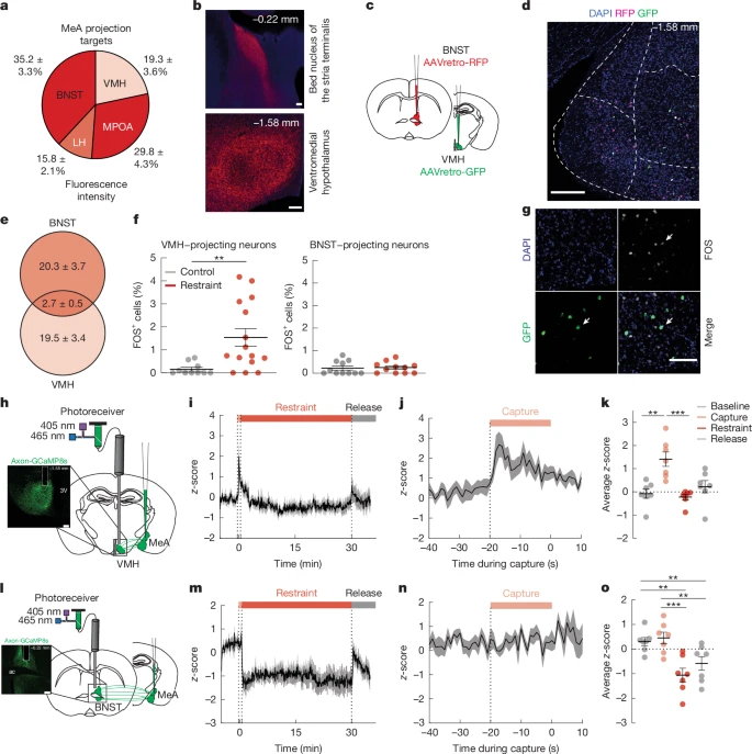 Чтобы расширить эти исследования и определить динамику нейронной активности в этих цепях во времени, мы использовали волоконную фотометрию для визуализации кальция in vivo в проекционных цепях MeAVMH и MeABNST с подачей MeA GCaMP, нацеленного на аксоны (AAV-hSyn-axon-jGCaMP8s-P2A-mRuby3), и размещением волокна над VMH (рис. 1). 2h) или BNST (рис. 2l). Мы обнаружили, что нейронная активность проекционных нейронов MeAVMH была значительно повышена в период capture непосредственно перед 5–минутным и 30-минутным удерживающим стрессом (рис. 2i-k и дополнительный рис. 4a–e). Активность в проекционных нейронах MeAVMH также повышалась при 5–минутном и 30-минутном territorialized cage stress (расширенные данные на рис. 3a-d и дополнительный рис. 4f–h), с использованием footshock и подхода robobug (дополнительный рис. 4m–p), но не с использованием новой чистой клетки (дополнительный рис. 4i–l). Вызванное стрессом повышение активности проекционных нейронов MeAVMH предшествовало повышению системного уровня глюкозы у мышей с непрерывным мониторингом уровня глюкозы (расширенные данные на рис. 3e,f). Напротив, в то время как активность проекционных нейронов MeABNST значительно повышалась при 5–минутном и 30–минутном воздействии новой клетки (расширенные данные, рис. 3g–j и дополнительный рис. 4v-x), активность значительно не повышалась до, во время или после 5-минутного или 30-минутного ограничительного воздействия (рис. 2m-o). и дополнительный рис. 4q–u), с помощью footshock или с использованием метода robobug (дополнительный рис. 4ac–af), или с использованием новой чистой клетки (дополнительный рис. 4y–ab).