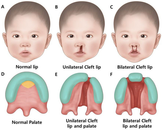 Figure 2. The anatomical spectrum of normal and cleft lip and/or palate malformations in humans. (A–C) Frontal facial views show variations in lip formation. (A) Normal lip morphology with complete fusion. (B) The unilateral cleft lip is showing incomplete fusion on one side. (C) Bilateral cleft lip presenting incomplete fusion on both sides of the upper lip. (D–F) Oral views of the palatal region depicting normal and cleft phenotypes. (D) Normal palate showing complete fusion of palatal shelves. (E) Unilateral cleft lip and palate with the incomplete fusion of the palatal shelf on one side. (F) Bilateral cleft lip and palate showing incomplete fusion of palatal shelves on both sides. Color code: turquoise—maxillary tissue; yellow—primary palate; pink—palatal and soft tissues.