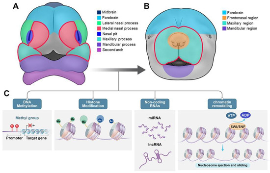 Figure 5. Epigenetic regulation during craniofacial development. (A,B) Schematic representation of early craniofacial development showing the morphological changes from initial facial prominences to their fusion. (A) The left panel shows the initial facial prominences, including midbrain, forebrain, lateral and medial nasal processes, nasal pit, maxillary and mandibular processes, and second arch. (B) The right panel shows the subsequent development of the frontonasal region, maxillary region, and the mandibular region. (C) Four major epigenetic mechanisms regulating craniofacial development: DNA methylation: addition of methyl groups to promoter regions controlling target gene expression. The red cross symbol means that the expression of the target gene is suppressed. Histone modification: post-translational modifications, including methylation (Me) and acetylation (Ac) of histone proteins. Non-coding RNAs: involvement of microRNAs (miRNA) and long non-coding RNAs (lncRNA) in gene regulation. Chromatin remodeling: ATP-dependent nucleosome ejection and sliding mediated by SWI/SNF complexes. Color code: dark blue—midbrain; light blue—forebrain; green—lateral nasal process; red—medial nasal process; navy blue—nasal pit; turquoise—maxillary process; purple—mandibular process and second arch; orange—frontonasal region; gray—other facial region behind maxillary/mandibular regions.