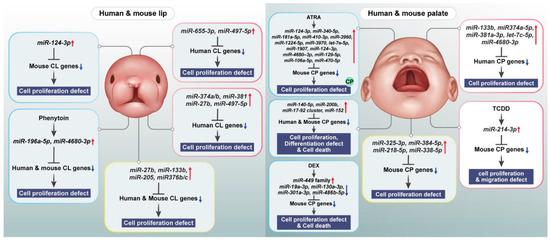 Figure 6. Summary of the miRNAs and genes associated with cleft lip and/or palate (CL/P) in mice and human. The complex miRNA-mediated regulatory networks involved in cleft lip and/or palate (CL/P). Environmental factors also affect cleft palate development by modulating miRNA activity, and how their dysregulation contributes to cleft formation through cell proliferation defects, differentiation defects, and cell death. Red arrows; graph showing genes going up, blue arrows; graph showing genes going down. CL, cleft lip; CP, cleft palate.