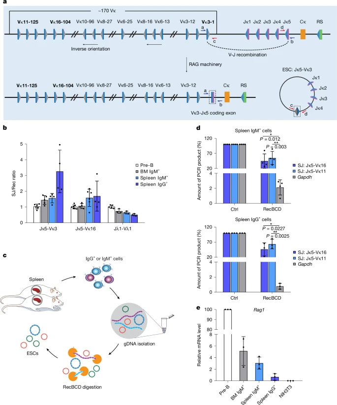 Наличие значительно более высоких фракций ESCs по сравнению с Gapdh после лечения убедительно указывает на то, что ESCs имеют круглую форму в IgM+ и IgG+ В-клетках селезенки мышей. Более того, очень низкая экспрессия Rag1 в клетках IgG+ означает, что циклические ESCs реплицируются и сохраняются с более ранних стадий, а не образуются вновь (рис. 1е).