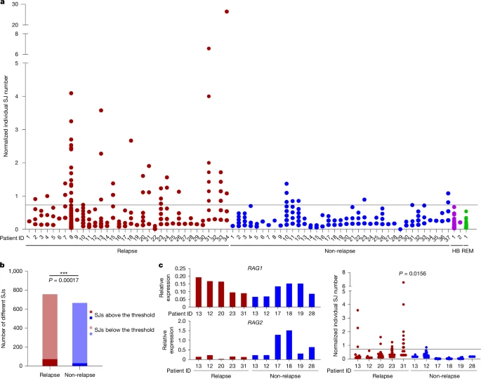 Увеличение числа копий ESC у пациентов, у которых впоследствии возникает рецидив, означает, что ESC реплицируются. В соответствии с этим, мы идентифицировали семь SJS, которые были более многочисленны, чем их соответствующие рекомбинационные соединения, используя ddPCR (Расширенные данные, рис. 4d). Аналогичным образом, сравнение количества SJS и рекомбинационных переходов при перестройках KDE-KV2-30 и KDE-KV3-20 в 48 образцах показывает, что количество SJS было значительно выше у пациентов, у которых впоследствии наблюдался рецидив (KDE-KV2-30: P = 0,0461, KDE-KV3-20: P = 9,25 х 10-5). Напротив, гораздо меньшее увеличение (KDE-KV2-30: P = 0,0756, KDE-KV3-20: P = 0,0173) наблюдалось в соответствующих рекомбинационных соединениях (расширенные данные на рис. 4e,f).