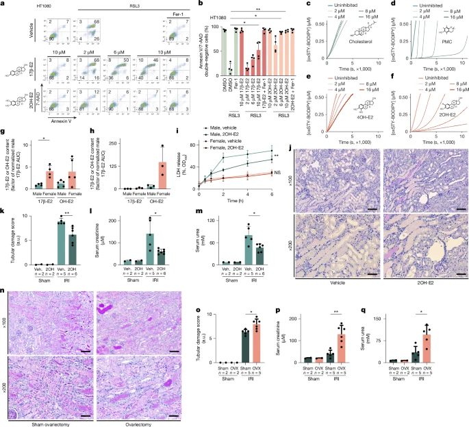 Широкий обзор 5,4 миллионов получателей медицинской помощи Medicare продемонстрировал значительно более низкую частоту AKI у женщин 11. Аналогичным образом, многочисленные клинические исследования выявили более высокую частоту AKI и более высокую смертность, связанную с AKI, у мужчин 12-15, особенно по сравнению с женщинами в пременопаузе 16,17. Мы предположили, что такие половые различия связаны с чувствительностью к острому канальцевому некрозу (ATN) 1, отличительным признаком которого является гибель клеток в результате ферроптоза 18-20, формы некроза, катализируемого железом, и преобладающего типа гибели клеток в почечных канальцах при AKI 1,8,21. На наш взгляд, половые различия после AKI вызванного ишемически–реперфузионным повреждением (IRI), были даже более выраженными, чем ожидалось из литературы 16,22 (рис. 1а,б). Важно отметить, что половые различия были зафиксированы, когда мы сравнили изолированные почечные канальцы мышей-самцов и самок и оценили высвобождение LDH (рис. 1с). Мы отметили, что ранее описанный процесс гибели клеток в мужских канальцах (рис. 1d, Дополнительные рис. 1a, b и дополнительные видео 1 и 2), который приводит к потере целостности митохондрий (дополнительные рис. 1c–e и дополнительное видео 3), в женских канальцах отсутствовал (рис. 1e,f, Дополнительный рис. 2a,b и дополнительное видео 4). Хотя ингибитор ферроптоза ferrostatin-1 (Fer-1) предотвращал положительную реакцию на SYTOX в мужских канальцах, он не оказывал существенного влияния на женские канальцы (рис. 1g и дополнительное видео 5). Аналогичным образом, хотя Fer-1 снижал высвобождение LDH из мужских канальцев, он не защищал женские канальцы (рис. 1h). В качестве контроля были исследованы почечные канальцы с комбинированным некроптозом и пироптозно-дефицитным поражением, выделенными у мышей с двойным нокаутом Mlkl и Gsdmd, и не было выявлено существенных различий по сравнению с однопометниками дикого типа (дополнительный рис. 2с). В то время как ранее было продемонстрировано, что самцы мышей дикого типа защищены от IRI с помощью Fer-18 или его более мощного аналога UAMC-3203 23, эти небольшие молекулы не защищали самок мышей от повышения концентраций мочевины и креатинина в сыворотке крови и от структурных повреждений (рис. 1i-l и расширенные данные на рис. 1). 1a–e). Этот результат был согласован при различных исследованных дозах ишемии перед реперфузией (расширенные данные на рис. 1f–i). Трансгенные мыши Gpx4fl/flROSA26-CreERT2 погибают в течение 14 дней после активации рекомбиназы Cre 20. По сравнению с самцами–однопометниками, у таких мышей-самок был обнаружен меньший канальцевый некроз (расширенные данные, рис. 3a-c), а также более низкие концентрации креатинина и мочевины в сыворотке крови (рис. 1m, n) через 10 дней после применения тамоксифена, но не было существенной разницы в общей выживаемости (расширенные данные, рис. 3d).. В то же время не было обнаружено различий в экспрессии GPX4 в канальцах по признаку пола (расширенные данные, рис. 3е). В совокупности эти данные указывают на то, что в почечных канальцах самок прекращается размножение ферроптозных клеток, а ткань почечных канальцев эндогенно устойчива к ферроптозу.