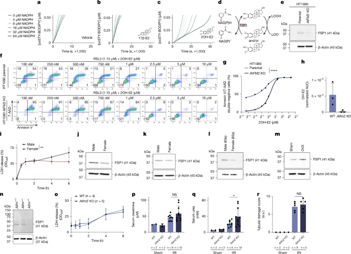 Мы задались вопросом, могут ли производные гидроксиоэстрадиола после окисления до соответствующих хинонов регенерироваться с помощью FSP1 (кодируемого AIFM2), как это было продемонстрировано для кофермента Q10 и витамина K10, 29. Добавление рекомбинантного FSP1 к тестам FENIX привело к усилению активности RTA среди всех протестированных производных эстрадиола (рис. 3a–c и расширенные данные рис. 6d–i). Поэтому мы предлагаем NADPH-зависимый регенеративный механизм регенерации эстрадиола (рис. 3d). Аналогичные эффекты были получены в бесклеточных системах, в которых аскорбат или супероксидный термический источник-1 (SOTS-1) были протестированы на их способность регенерировать производные эстрадиола (расширенные данные, рис. 6j–q). Мы сгенерировали опосредованный CRISPR–Cas9 нокаут AIFM2 (кодирующий FSP1) в клетках HT1080 (рис. 3e) и протестировали необходимую антиферроптозную дозу 2OH-E2 в родительских и нокаутных клетках (рис. 3f, g и расширенные данные рис. 7a). Для получения 50%-ной двойной негативности аннексина-V/7-AAD требуемая доза в родительских клетках составляла 750 нМ 2OH-E2, тогда как нокаутным клеткам требовалось не менее 2,5 мкм, а содержание восстановленного OH-E2, но не E2, было примерно в 100 раз ниже у мышей с дефицитом FSP1 (Рис. 3h и расширенные данные рис. 8a). В эндогенно устойчивых к ферроптозу клетках HT29 нокаут AIFM2 сенсибилизировал клетки к ферроптозу, индуцированному RSL3 (расширенные данные на фиг. 7b–e). Мы также исследовали специфический ингибитор FSP1 (viFSP1) в клетках HT1080 и HT29 с аналогичными результатами (расширенные данные на рис. 7f, g). Аналогичным образом, другие ингибиторы FSP1 сенсибилизировали устойчивые в других отношениях женские клеточные линии (клетки HT29 и HeLa) к ферроптозу (расширенные данные, рис. 7h, i). В соответствии с этими результатами, ингибитор ароматазы anastrozole повышал чувствительность клеток HeLa к ферроптозу, а дополнительная обработка viFSP1 не приводила к дополнительной чувствительности этих клеток (расширенные данные, рис. 7j). Однако описанные выше половые различия в почечных канальцах не были полностью устранены дефицитом FSP1 (рис. 3i), что побудило нас исследовать общую экспрессию FSP1 в мужских и женских почечных канальцах. В лизатах канальцев, полученных от мышей, свиней и человека, экспрессия FSP1 была выше у самцов (рис. 3j–l). В соответствии с этими данными, экспрессия FSP1 в канальцах самок увеличивалась после овариэктомии (рис. 3м). Мы подтвердили специфичность антител у мышей дикого типа, гетерозиготных и Aifm2-нокаутированных мышей (рис. 3n). В анализе высвобождения LDH из почечных канальцев ни нокаут Aifm2, ни три различные дозы viFSP1 не показали существенных различий (рис. 3o и расширенные данные рис. 8b), что указывает на наличие дополнительных антиферроптозных систем в канальцевом отделе. В соответствии с этой гипотезой, мы наблюдали незначительную тенденцию к сенсибилизации у самок мышей с дефицитом FSP1 (Aifm2-нокаутом) в модели IRI почек (рис. 3p-r и расширенные данные рис. 8c). Поэтому мы исследовали потенциальные компенсаторные механизмы в канальцах мышей с дефицитом FSP1. В то время как нокаут Aifm2 не повлиял на GPX4 и ACSL4, мы обнаружили повышенные уровни тиоредоксиновой системы (тиоредоксин (TRX) и пероксиредоксин 1 (PRX1)) у самцов и самок мышей (расширенные данные, рис. 8d, e). После ингибирования пути PRX1 (который также включает тиоредоксинредуктазу 1) с помощью FTC30 мы запустили гипе
