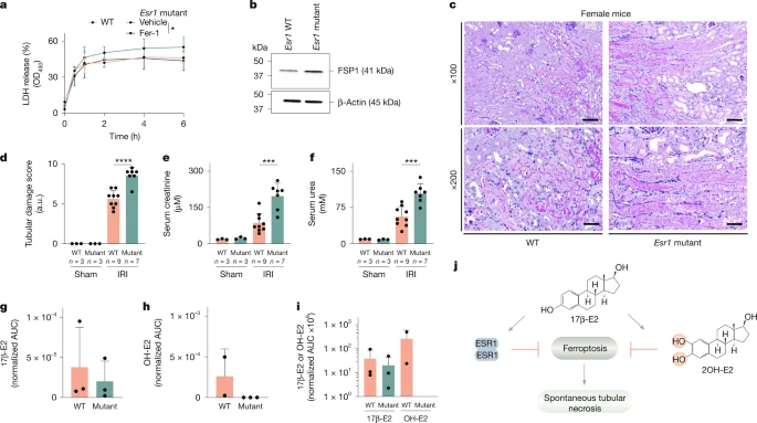 Мы разводили гетерозиготных мышей с дефицитом ESR1 для получения родительских однопометников (как дикого типа, так и гетерозиготных) и мышей с дефицитом ESR1. Изолированные почечные канальцы самок мышей с дефицитом ESR1 продемонстрировали более высокое высвобождение LDH по сравнению с однопометниками дикого типа (рис. 4а), а обработка Fer-1 обратила это увеличение к уровню необработанных мышей дикого типа (рис. 4а). В соответствии с рис. 3j–m, экспрессия белка FSP1 в тубулярных лизатах мышей-мутантов ESR1 была повышена (рис. 4b). Как и ожидалось в эксперименте с канальцами, самки мышей с дефицитом ESR1 были значительно более чувствительны к IRI почек (рис. 4c–f). Примечательно, что в то время как у этих мышей фиксировались уровни 17β-эстрадиола у мышей дикого типа, гидроксиоэстрадиолы не обнаруживались в канальцах мышей с дефицитом ESR1 (рис. 4g–i). Поскольку дисфункция ESR1 коррелирует с отсутствием 2OH-E2 и гиперчувствительностью к ферроптозу, независимо от усиления регуляции FSP1, этот подход позволил нам дифференцировать геномные функции эстрадиолов от негеномных (рис. 4j). Как и ожидалось, мощный ферростатин проявлял защитные эффекты после IRI у самок мышей с дефицитом ESR1 (расширенные данные на фиг. 9a–d). В совокупности эти данные демонстрируют, что ESR1 на геномном уровне способствует антиферроптозному состоянию почечных канальцев у женщин. Однако регуляция FSP1 не смогла полностью объяснить половые различия в чувствительности к AKI что побудило нас исследовать другие геномно регулируемые, ESR1-зависимые системы регуляции ферроптоза.