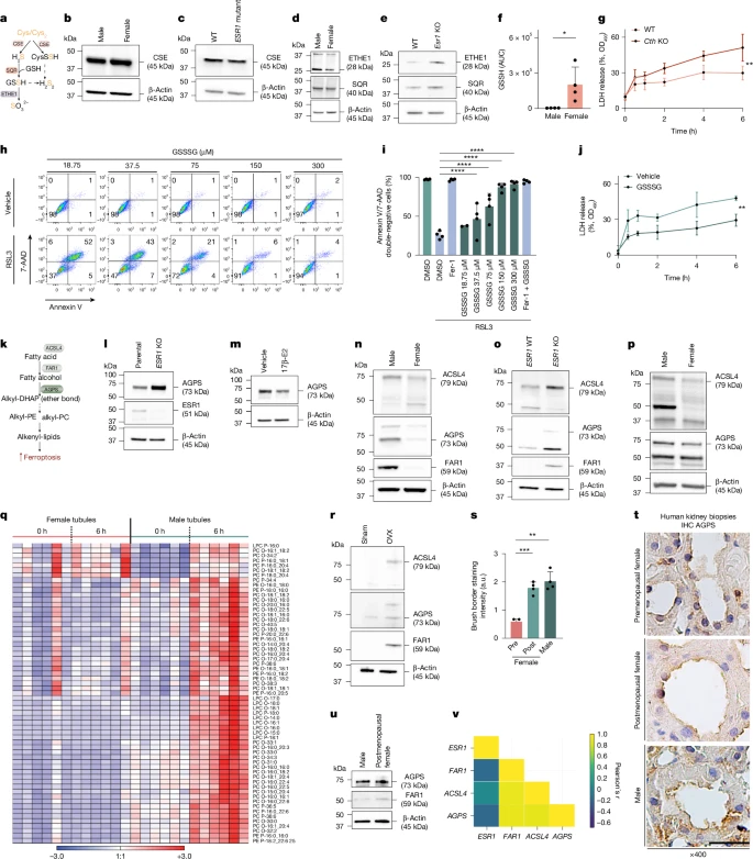 В отличие от гидроперсульфидов, недавно было продемонстрировано, что пластичность эфирных липидов повышает чувствительность опухолей мышей к ферроптозу34, но потенциальная роль в остром повреждении тканей не была оценена. Поэтому мы исследовали ключевые ферменты в процессе производства эфиров и липидов (рис. 5к). Нокаут ESR1 в клетках HT29, которые, как известно, нечувствительны к классическим FINs, привел к заметному повышению активности AGPS, единственного известного белка, генерирующего эфирную связь, по сравнению с родительскими клетками (рис. 5l). И наоборот, мы наблюдали снижение уровня AGPS после инкубации с E2 (рис. 5м). В соответствии с предыдущим отчетом35, CRISPR–Cas9-опосредованный нокаут FAR1 в клетках CD10 и HT1080 не снижал чувствительность клеток к ферроптозу, вызванному каким–либо из протестированных FINs (расширенные данные, рис. 10a-f). Однако экспрессия канальцевых белков ACSL4, FAR1 и AGPS была повышена в мужских и женских канальцах с дефицитом ESR1 (рис. 5n,o). Хотя нам не удалось выявить антитела к свиному FAR1, аналогичные эффекты для ACSL4 и AGPS были зафиксированы в свежевыделенных свиных канальцах (рис. 5п), что позволяет предположить, что этот эффект сохранялся в ходе эволюции млекопитающих. Это побудило нас напрямую сравнить липидомы свежеизолированных мужских и женских канальцев с течением времени. Во-первых, мы обнаружили более высокие уровни эфирных липидов в канальцах мышей-самцов в исходных условиях (расширенные данные, рис. 10г). Важно отметить, что эфирные фосфолипиды были заметно повышены в процессе повреждения канальцев только в мужских почечных канальцах (рис. 5q), в то время как соответствующие эфирные фосфолипиды, использованные в качестве контроля, не демонстрировали сопоставимой картины (расширенные данные, рис. 10h). Эти данные указывают на то, что проферроптотическая пластичность эфирных липидов является специфической особенностью мужских, но не женских канальцев, и что путь выработки эфирных липидов подавляется ESR1-зависимым образом. Поэтому мы предположили, что это торможение будет утрачено после наступления менопаузы. Действительно, когда мы исследовали искусственную систему овариэктомии в постменопаузе у мышей, чтобы протестировать экспрессию AGPS и FAR1, были обнаружены более высокие уровни AGPS и FAR1 на уровне белка по сравнению с самками мышей, подвергшихся искусственной операции (рис. 5r). В соответствии с этим наблюдением, иммуногистохимический анализ AGPS в наборе биоптатов почек человека продемонстрировал экспрессию белка AGPS в кистевых отделах проксимальных почечных канальцев у мужчин и женщин в постменопаузе и, в гораздо меньшей степени, в образцах, полученных от женщин в пременопаузе (рис. 5, а, т). Аналогичным образом, в лизатах свежеизолированных почечных канальцев человека, полученных от пациентов женского или мужского пола в постменопаузе, экспрессия AGPS и FAR1 была сопоставимой (рис. 5u). В целом, наши данные согласуются с общедоступной базой данных одноклеточного транскриптома почек человека, в которой экспрессия ACSL4, FAR1 и AGPS в проксимальных канальцах была выше в образцах с AKI по сравнению с контрольными образцами здоровых людей (расширенные данные, рис. 10i). Наконец, эффекты ESR1 лучше всего изучаются в контексте рака молочной железы. Мы сравнили экспрессию ACLS4, FAR1 и AGPS, соответственно, в клеточных линиях рака молочной желез