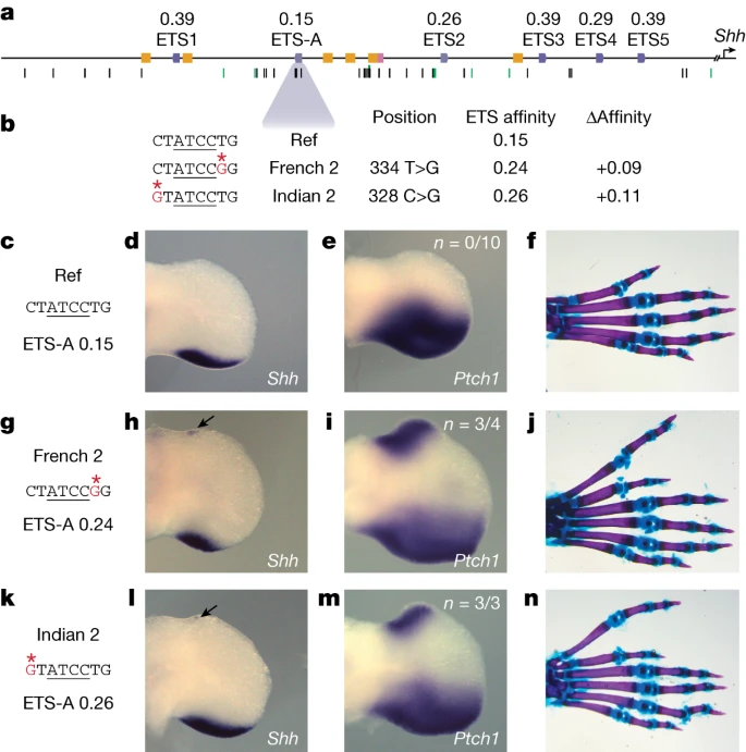 Тридцать один SNV в ZRS человека связан с полидактилией. Только семь из них находятся в пределах подтвержденных сайтов связывания; это, вероятно, является результатом вырожденной природы сайтов связывания и нашей слабой аннотации функциональных сайтов связывания в ZRS. Из семи SNV в сайтах связывания три являются SNV, оптимизирующими сродство. Два из этих SNV находятся в сайте ETS-A (French 2 и Indian 2) и один в сайте HOX (Dutch 2). Оптимизирующие сродство к ETS-A SNV вызывают эктопическую экспрессию GOF в переднем зачатке конечности. Стволовые тетраподы были полидактильными с семью или восемью пальцами50. Экспрессия репрессоров в переднем зачатке конечности могла способствовать возникновению пятизначного состояния. Мы предполагаем, что SNV, оптимизирующие сродство к ETS-A, вызывают эктопическую экспрессию в передней части зачатка конечности, поскольку повышение сродства нарушает баланс активаторов и репрессоров, действующих на энхансер в передней части зачатка конечности, а также в силу эволюционной чувствительности.