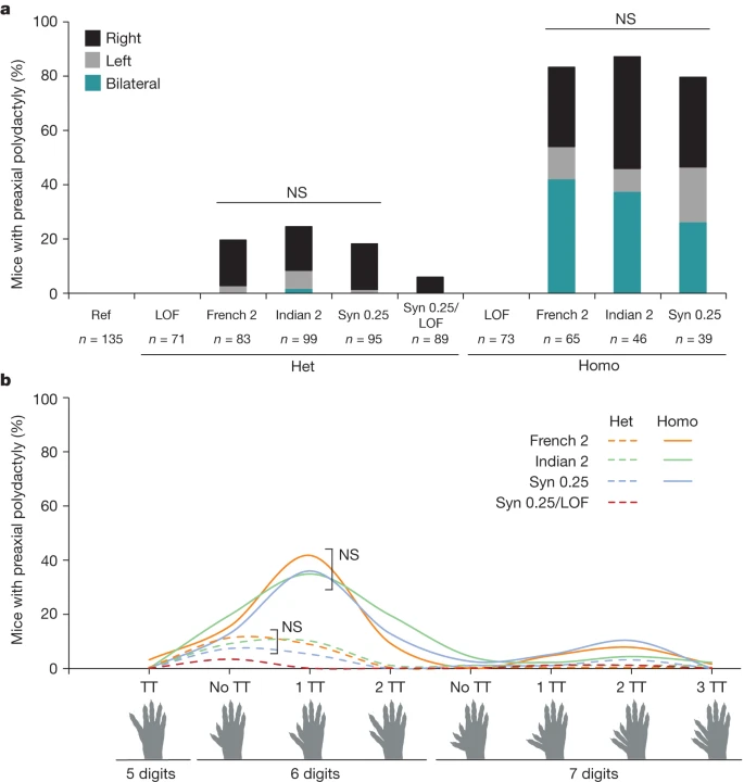 a, Penetrance and laterality of phenotypes seen in French 2, Indian 2 and Syn 0.25 heterozygous (Het) and homozygous (Homo) mice. There is no significant difference in penetrance and laterality between heterozygotes and between homozygotes of French 2, Indian 2 and Syn 0.25 mice (Fisher’s exact test). Polydactyly occurs more frequently on the right hindlimb in both heterozygotes and homozygotes. In Syn 0.25/LOF mice, polydactyly is less penetrant than in heterozygous Syn 0.25 mice (Syn 0.25/WT). NS, not significant. b, Polydactyly phenotypes seen in French 2, Indian 2 and Syn 0.25 heterozygotes (dashed lines) and homozygotes (solid lines), as well as in Syn 0.25/LOF mice. There is no significant difference in the phenotypes seen between the French 2, Indian 2 and Syn 0.25 lines (Fisher’s exact test). TT, triphalangeal toe. Biorender.com was used to generate images in this figure.