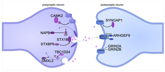 Pathogenic gene variants encoding pre- and postsynaptic transmembrane proteins can cause intellectual disability in DEE. The diagram shows the location of proteins relative to the synaptic cleft and the functions they perform. The proteins are systematized based on recent publications on DEE.