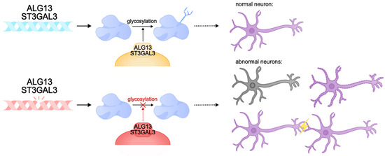 Figure 6. Pathogenic variants of ALG13 and ST3GAL3 can lead to congenital glycosylation disorders. These genes encode transmembrane glycosylation enzymes that play a critical role in the nervous system. Pathogenic variants can cause abnormalities in synapse function, neuronal membrane formation, and neuronal death. These abnormalities can result in intellectual disability, delayed development, and DEE.